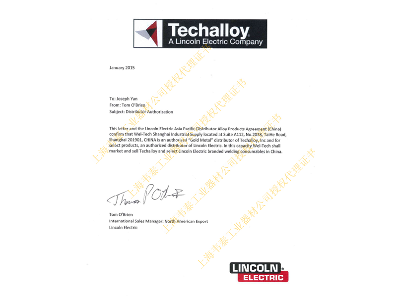 Lincoln享有的產(chǎn)品商標(biāo)有:Tech-Rod,Techalloy,Excalibur, Lincoln, Blue Max等